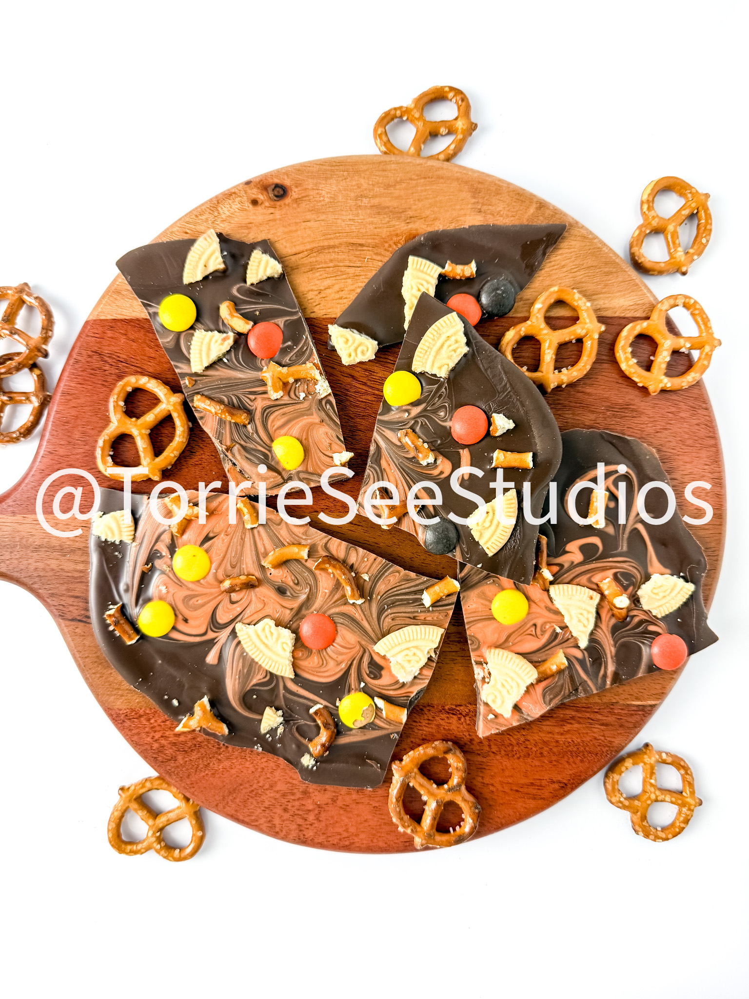 Featured Ingredients: Brown Melting Chocolate, Candy Coated Peanut Butter Pieces, Pretzels, Cookies