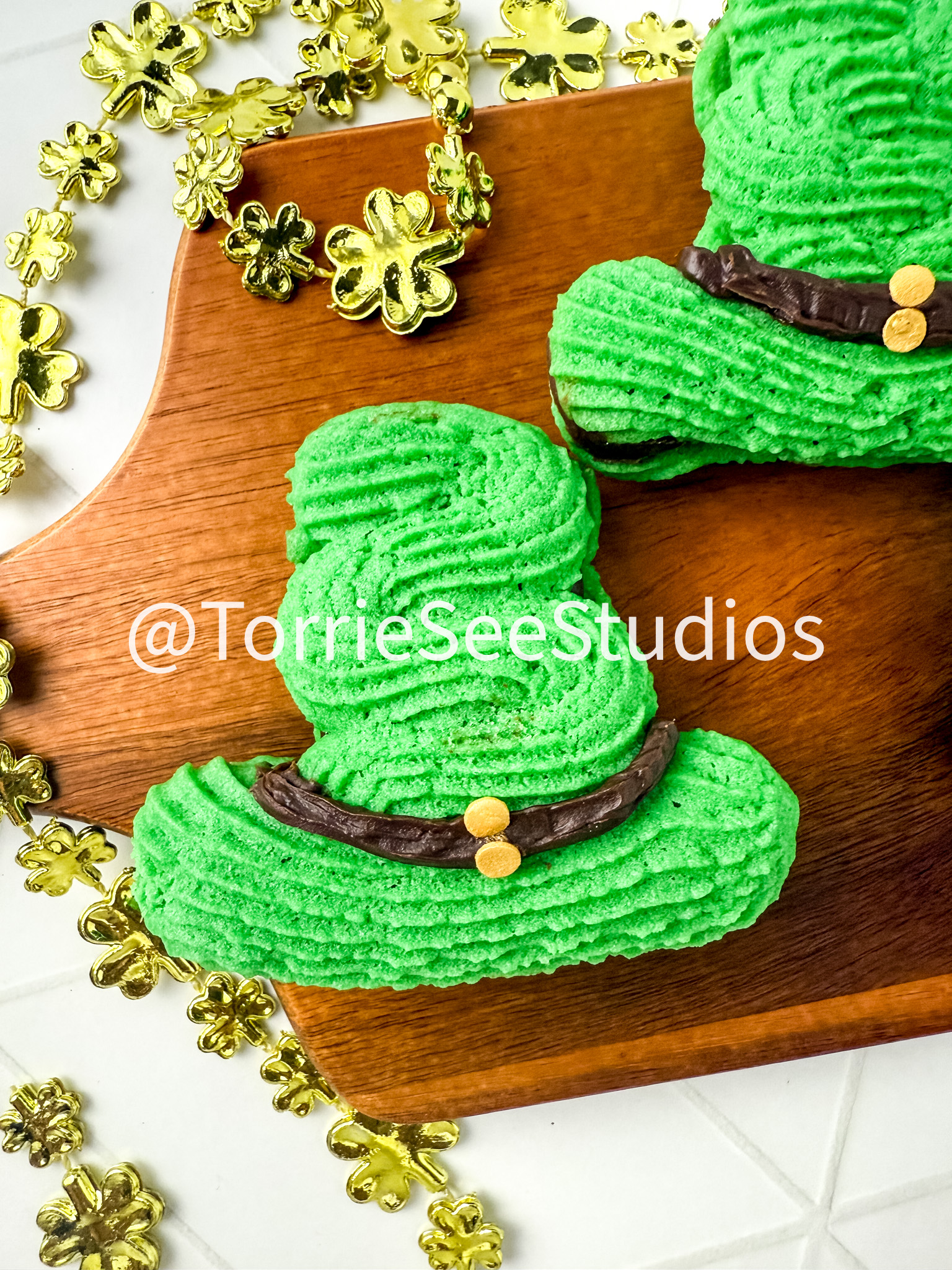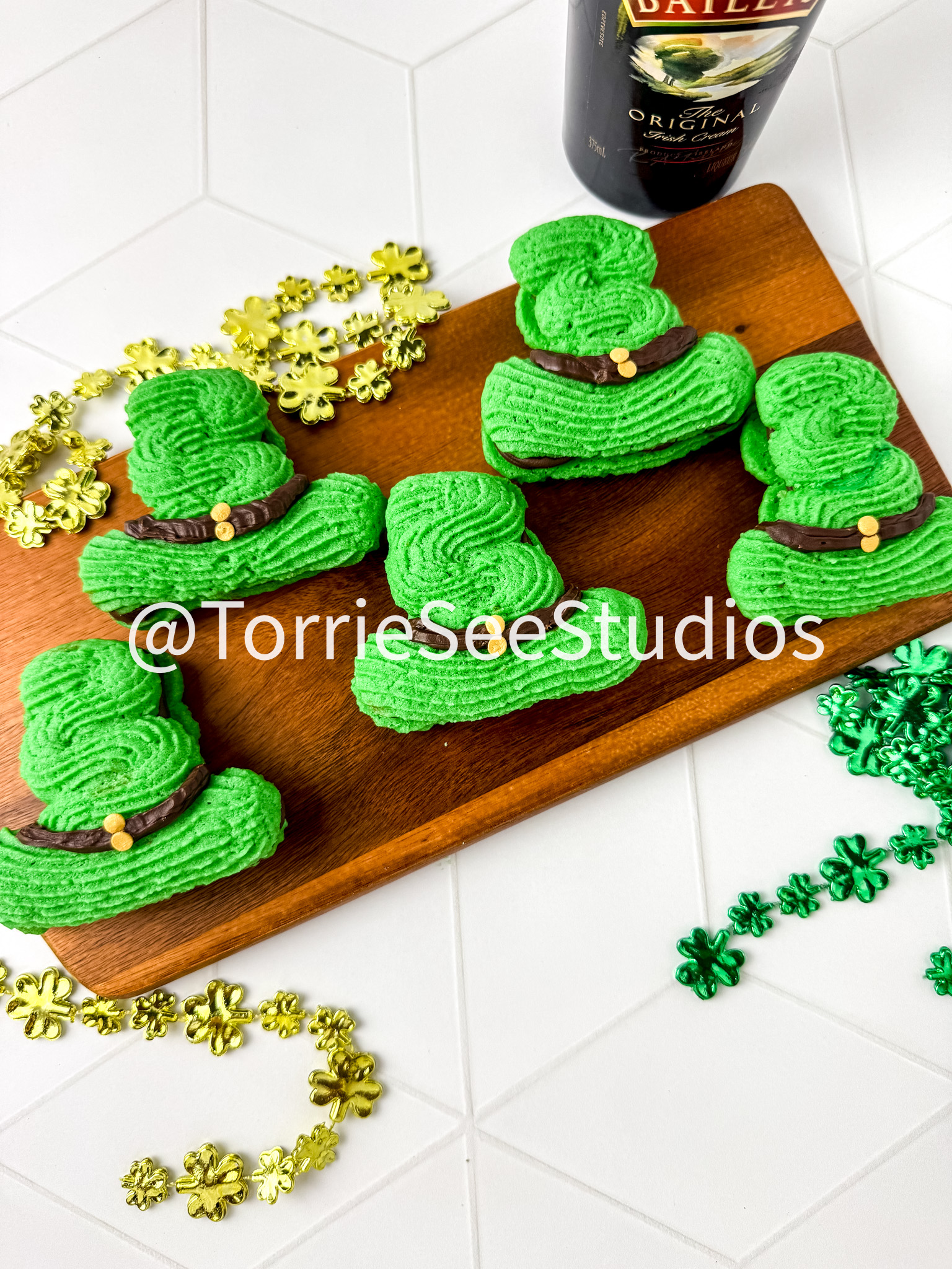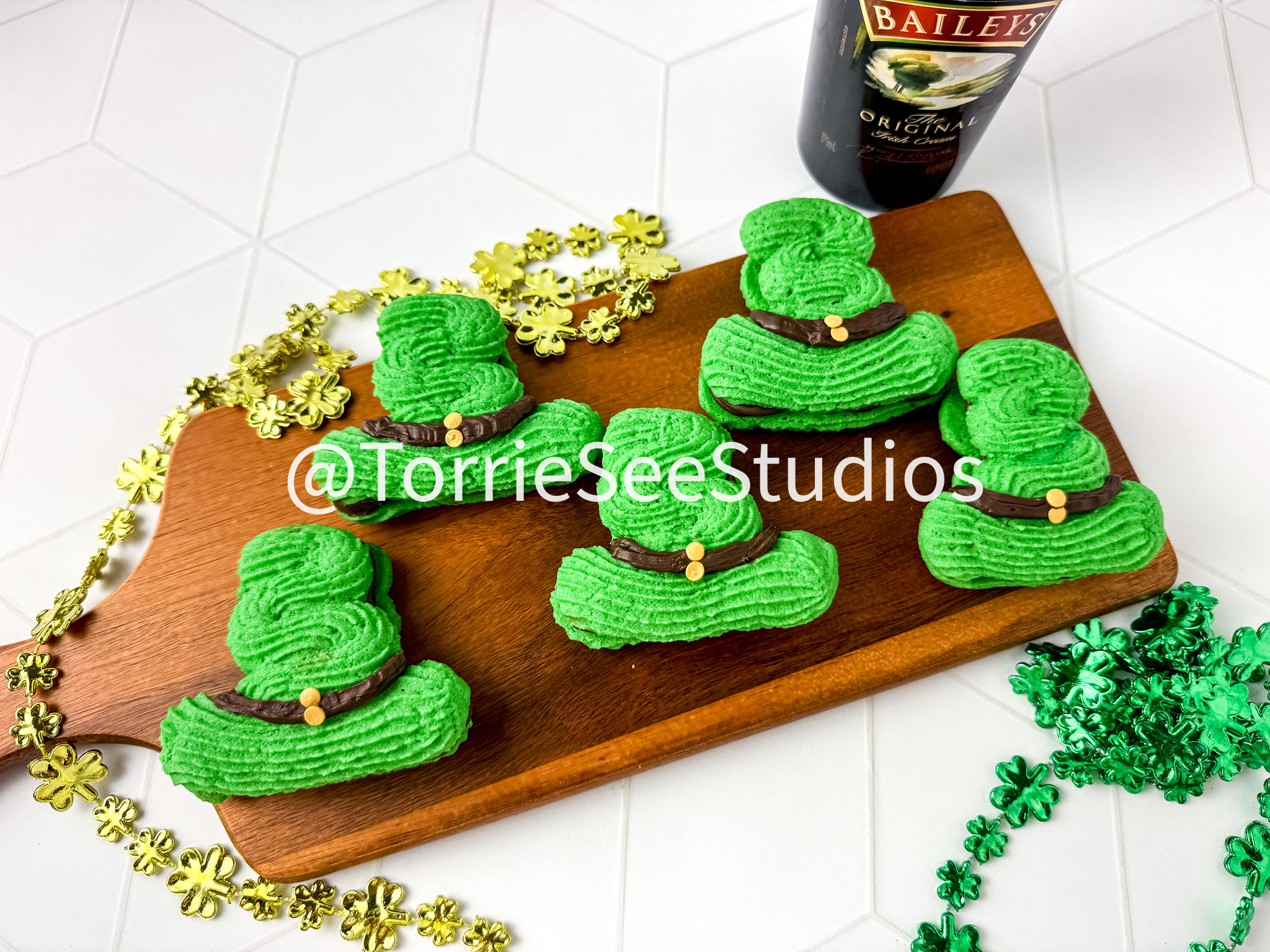 These Irish Cream Leprechaun Cookie Sandwiches are adorable, Delicious  and a perfect holiday treat. These cookies are buttery, green and filled with irish cream chocolate ganache. So you know they taste great and the hat shape makes them really fun.