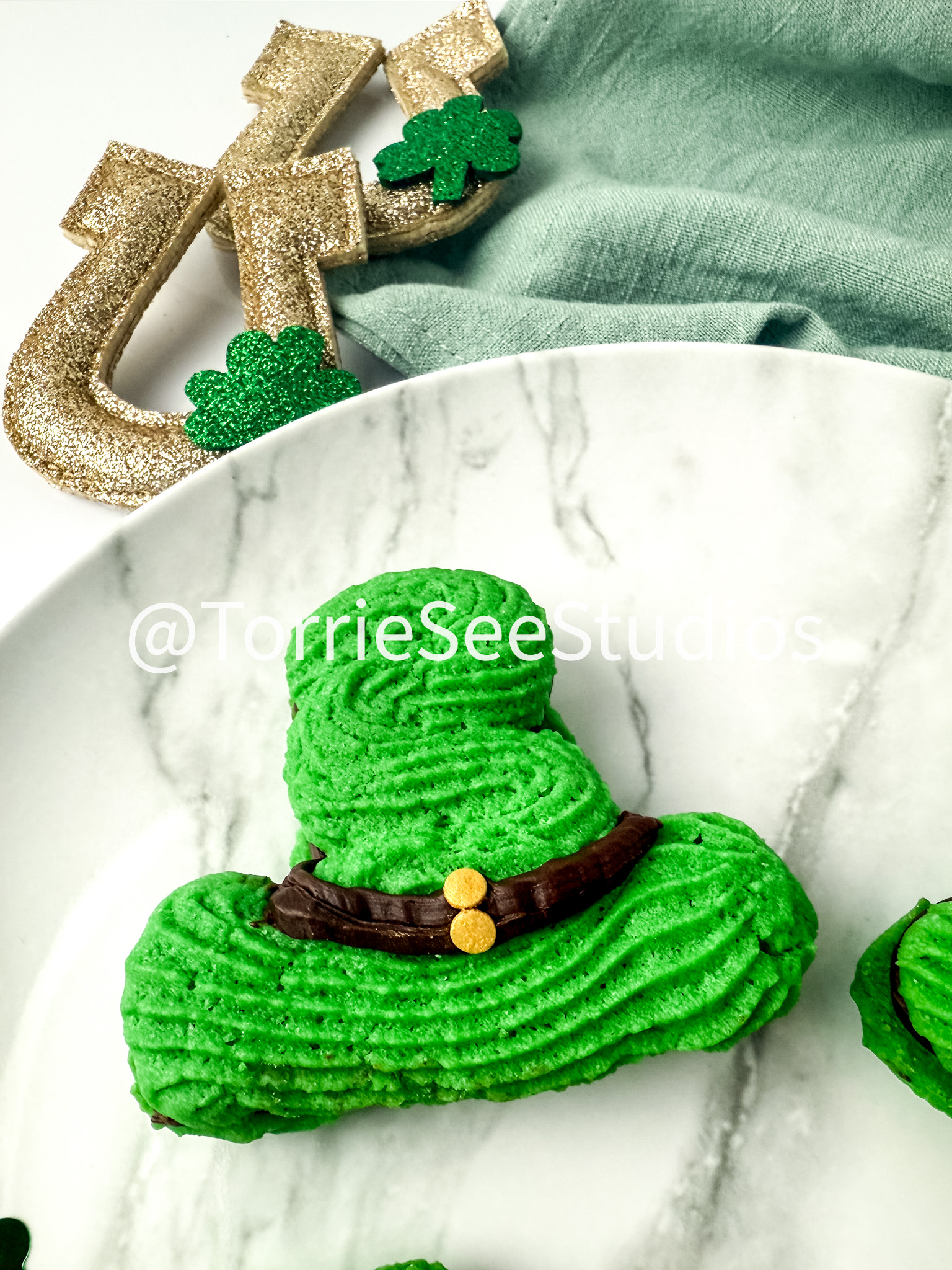These Irish Cream Leprechaun Cookie Sandwiches are adorable, Delicious  and a perfect holiday treat. These cookies are buttery, green and filled with irish cream chocolate ganache. So you know they taste great and the hat shape makes them really fun.