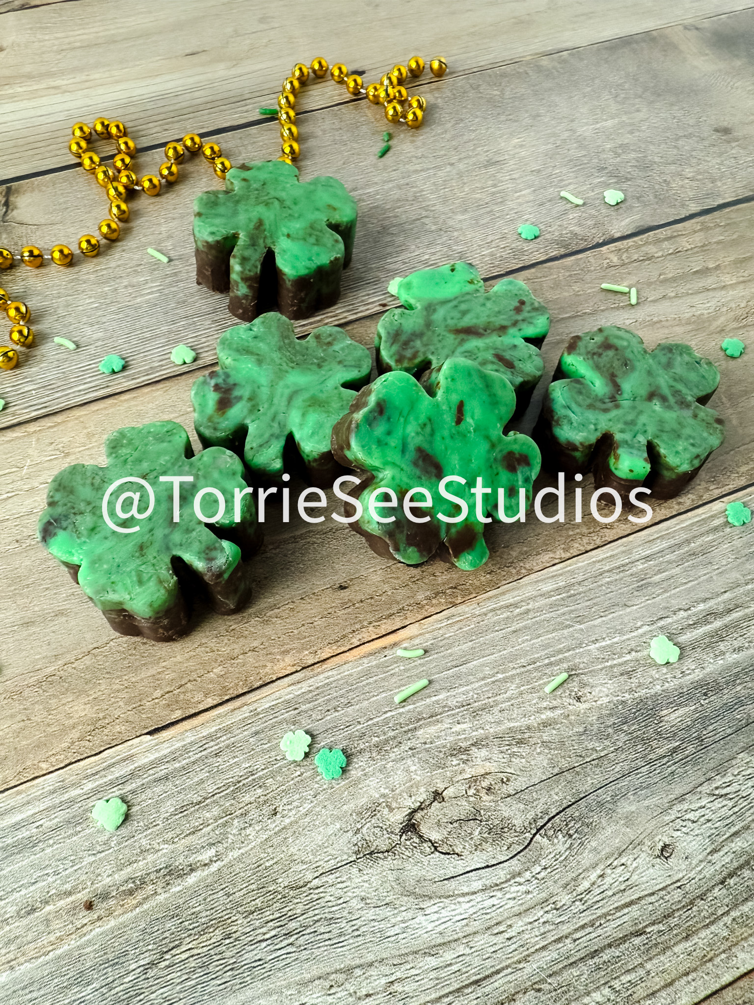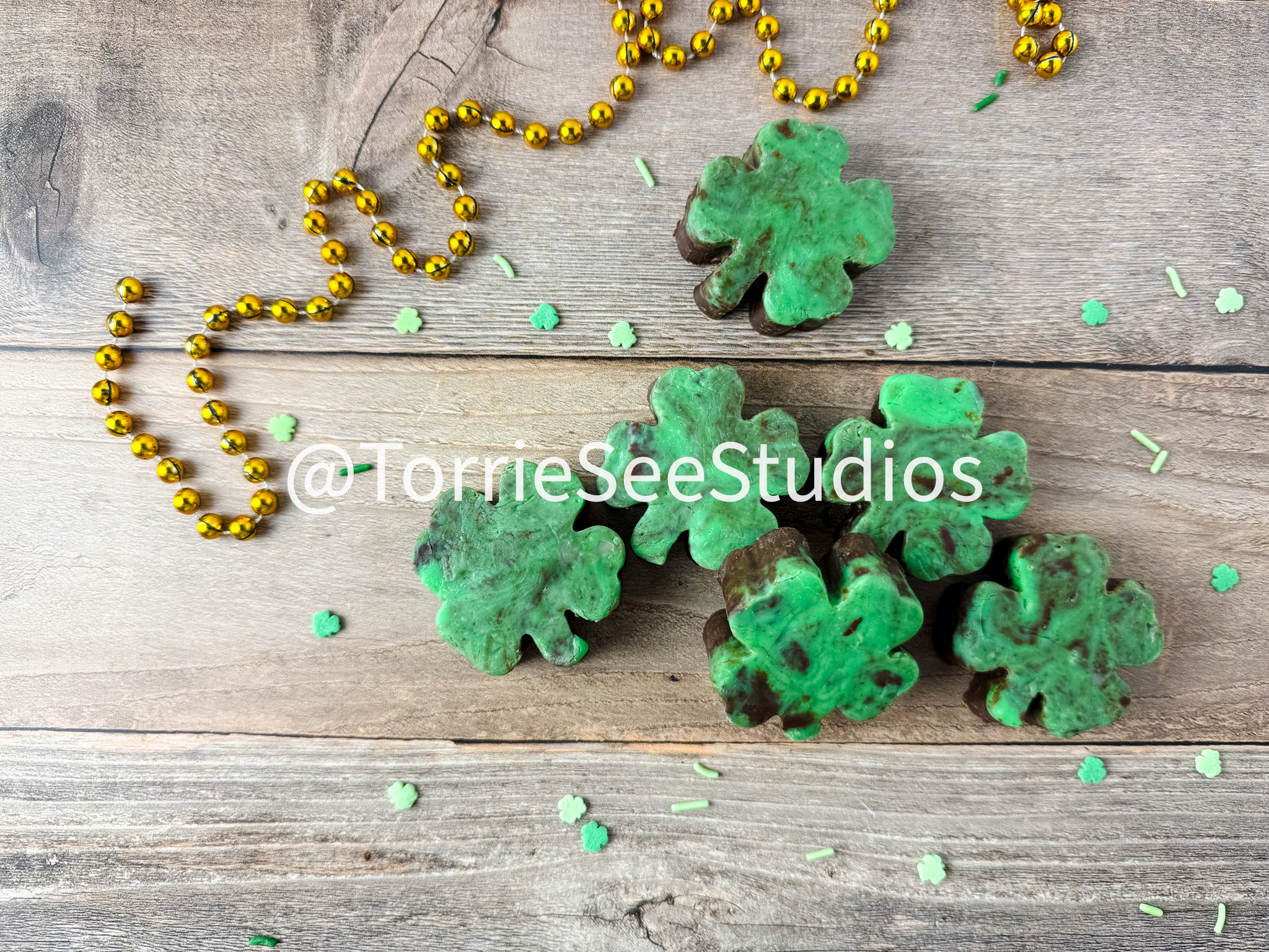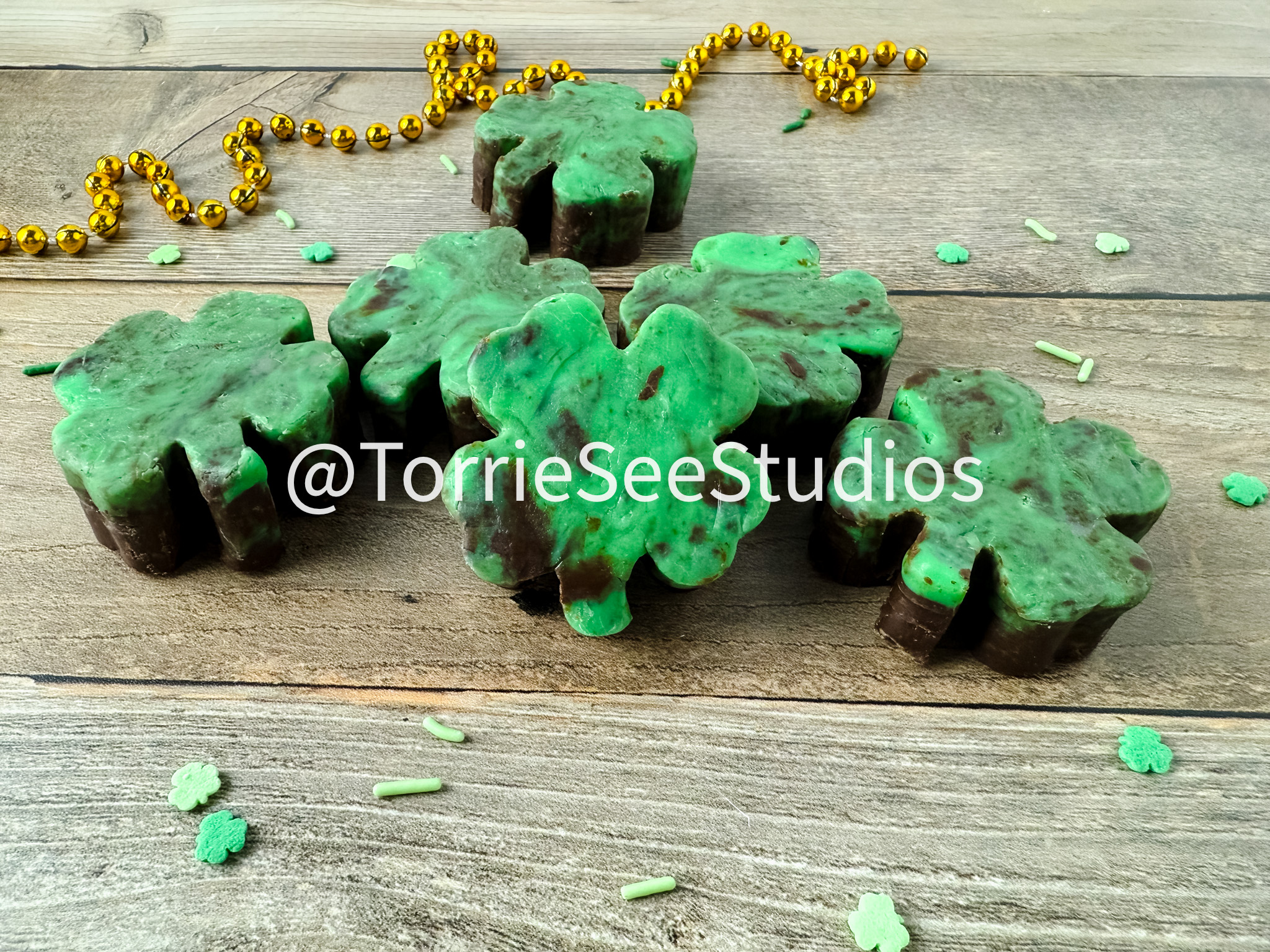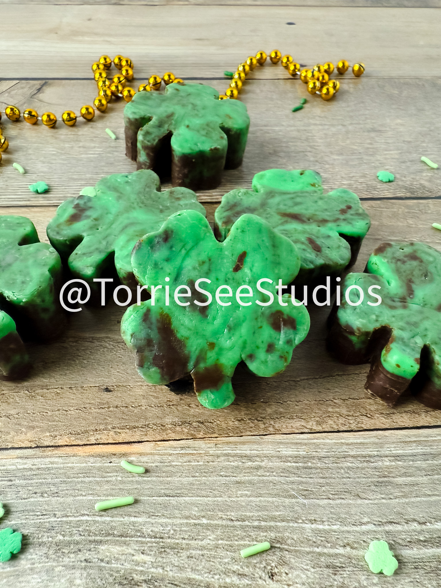Mint Chocolate Shamrock Fudge on Wood